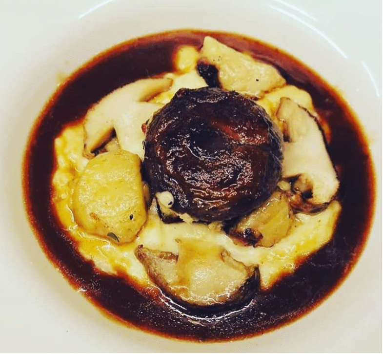 Cèpes des bois de Bouloc farcis à la chair à saucisse, escalope de foie gras d’oie, crème de topinambours, moelle de bœuf poêlée et jus de volaille