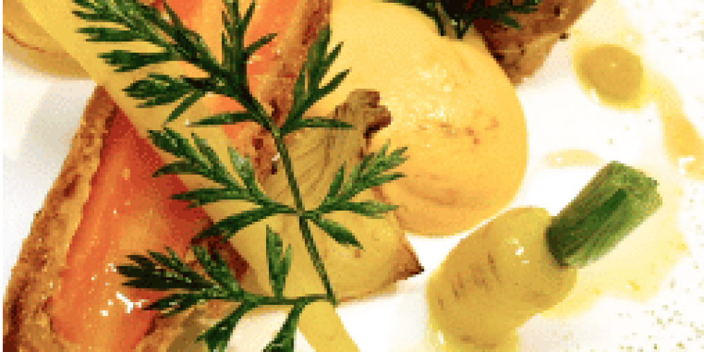 Gratter soigneusement les carottes (réserver les fanes pour frire en tempura). Les badigeonner avec la dorure et saupoudrer de cardamome verte. Enrouler dans une bande de feuilletage d’1 millimètre d’épaisseur. Dorer délicatement et saupoudrer de quelques f-graines de carotte. Cuire 10 minutes à 220 °C, puis 10 minutes à 180°C. Réserver.