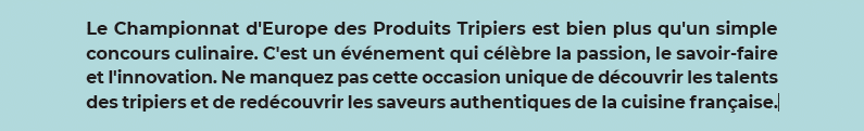 Cette année, le thème du concours est consacré au bœuf, à travers quatre abats emblématiques : cœur, rognon, panse et queue. Douze finalistes, venus de toute l’Europe, s’affronteront lors d’une épreuve de quatre heures pour proposer des recettes originales et audacieuses mettant en avant les produits tripiers origine France.