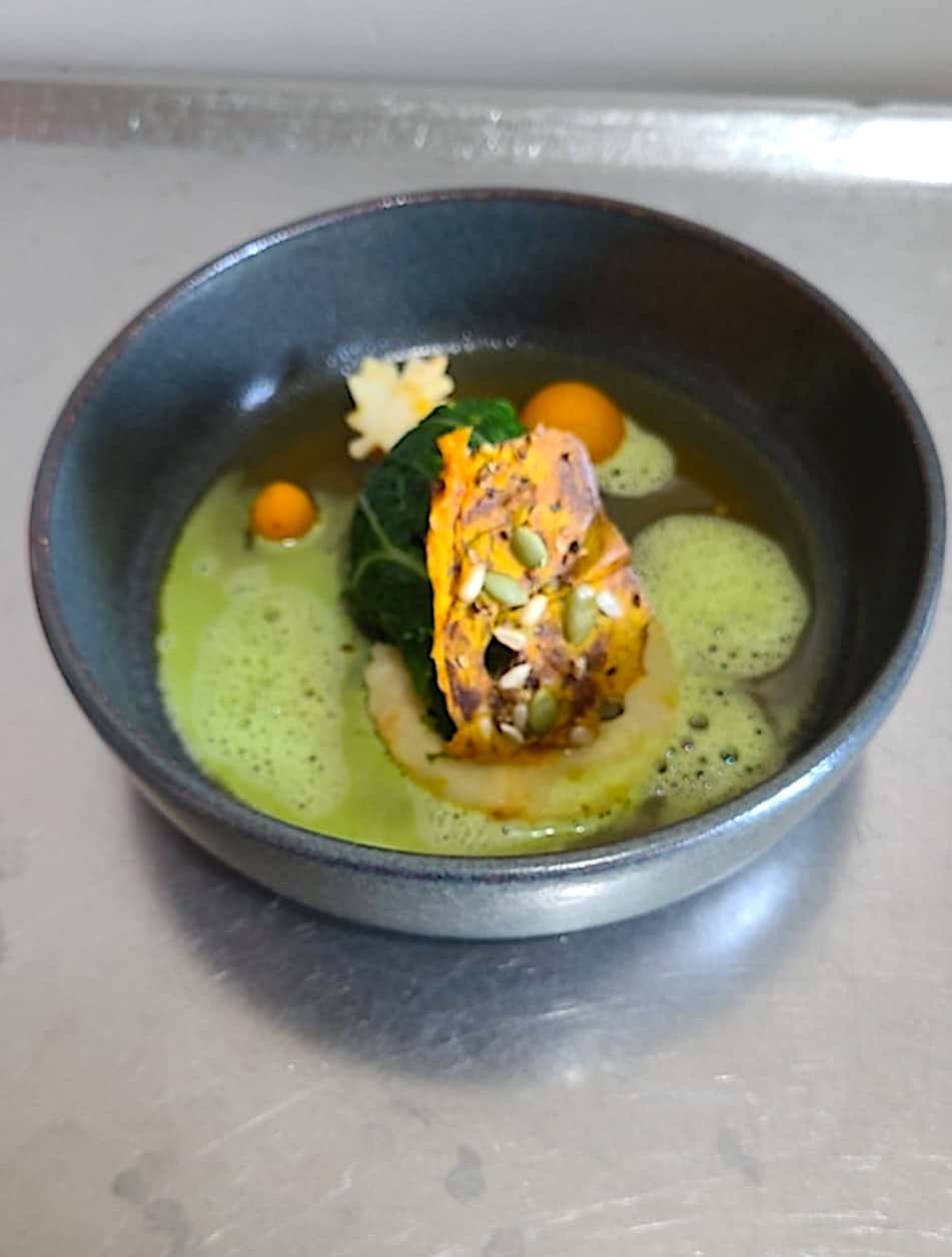 Plonger un mousseur à lait dans l’émulsion de persil et marjolaine pour d’incorporer de l’air quelques secondes avant le service pour réaliser de l’écume.