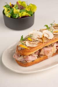Ici, le feuilletage pur beurre sert d’écrin à une garniture généreuse : béchamel aux cèpes, fricassée de champignons façon Jean Delaveyne, jambon à l’os effeuillé et Comté 18 mois. Une association raffinée qui transforme un classique du snacking en véritable plat bistronomique, idéal pour une carte de déjeuner, un room service ou une offre traiteur différenciante.