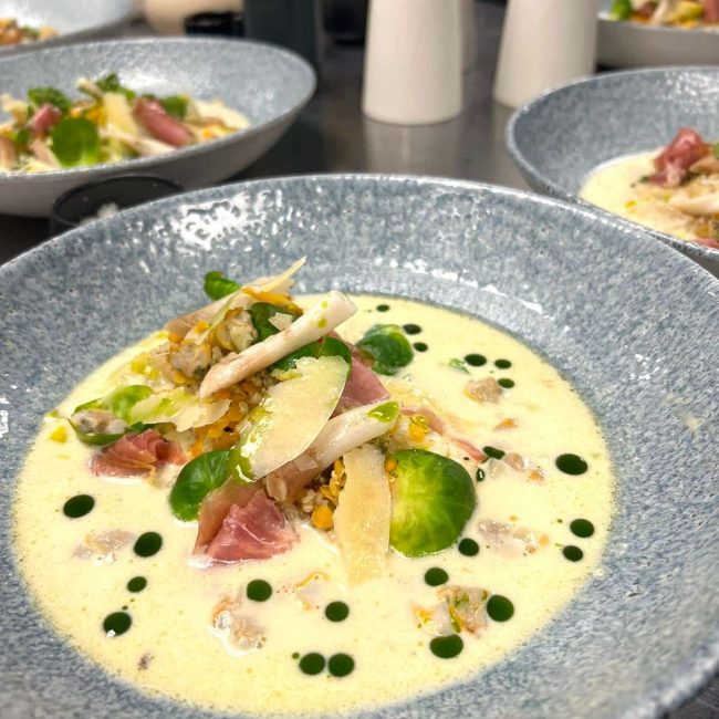 Langoustines roulées au lard du Lévezou, petit épeautre à l’encre de seiche et palourdes