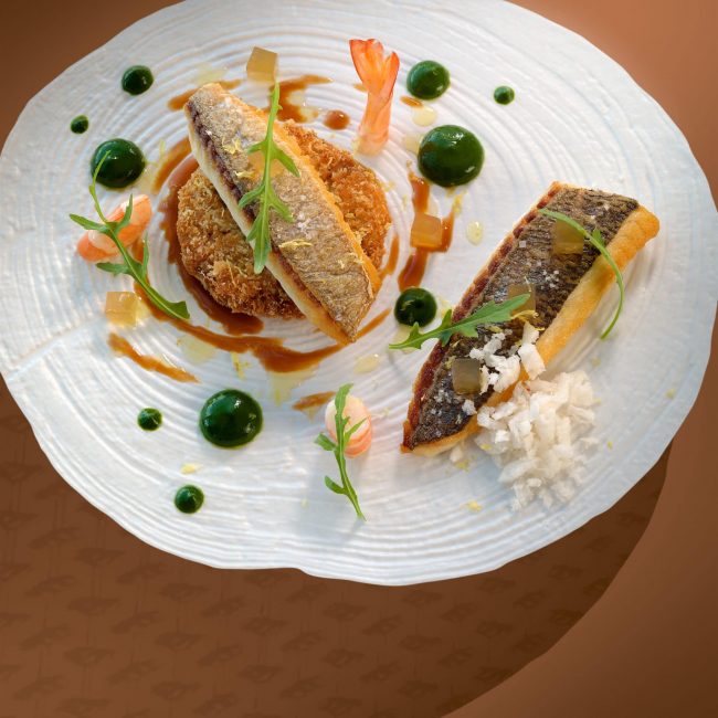 Aiguillette de daurade meunière, caviar d’aubergine infusé à la réglisse et roquette