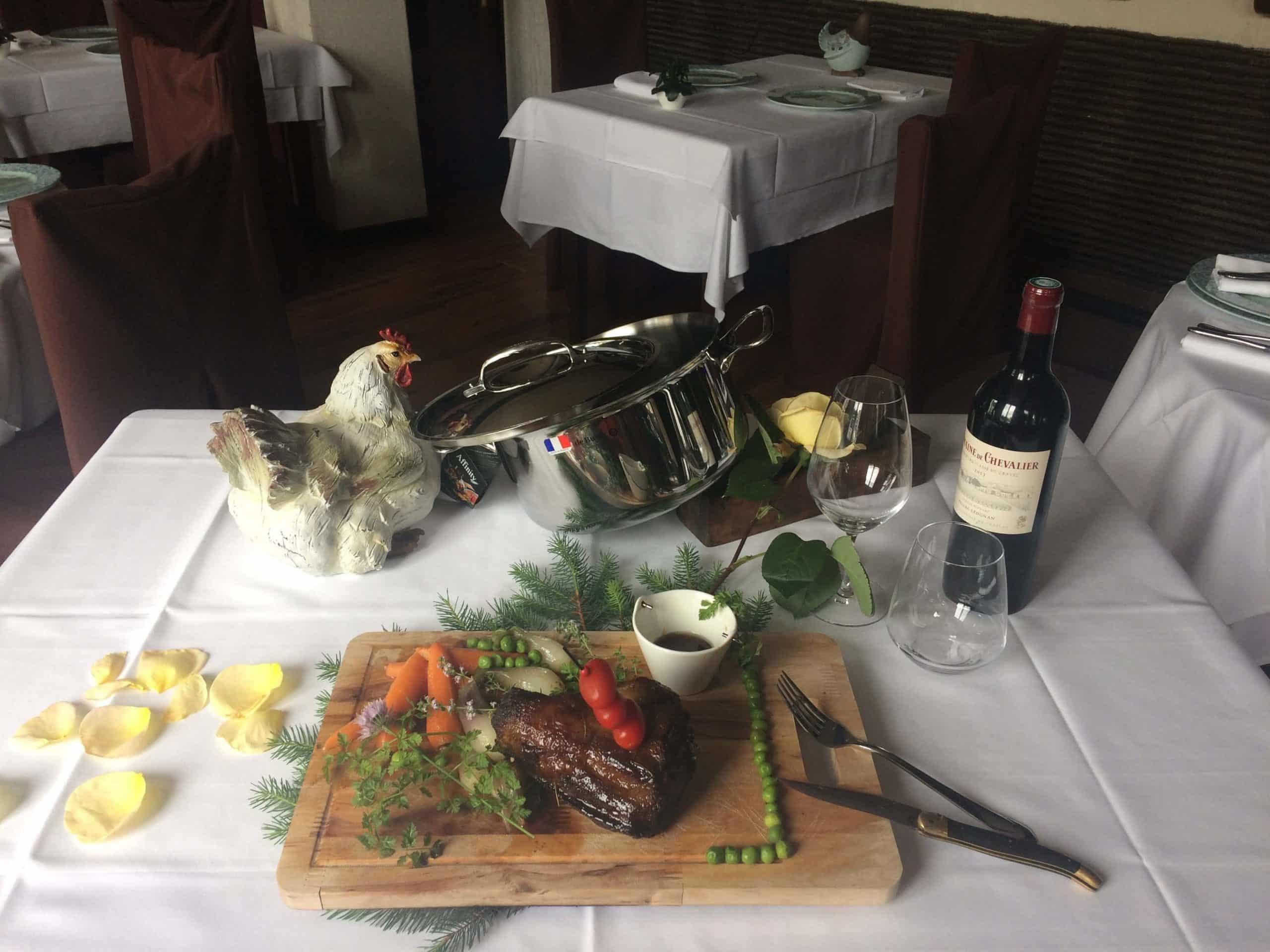 « Filet de boeuf flambé au Marc de Bourgogne, sauce aux bourgeons de cassis, carottes parfumées au poivre de cassis »
