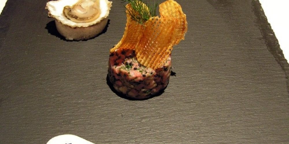 Couper le filet de veau en petits dés et l’assaisonner avec les ingrédients cités. Ouvrir les huîtres en gardant le jus. Haché les huîtres au couteau et les mélanger au tatare. Laver et éplucher les pommes de terre et réaliser des gaufrettes.