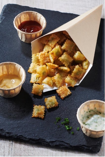 Ces ravioles, spécialement conçues pour une cuisson friteuse, soufflent à la cuisson et peuvent être utilisées de multiples façons :